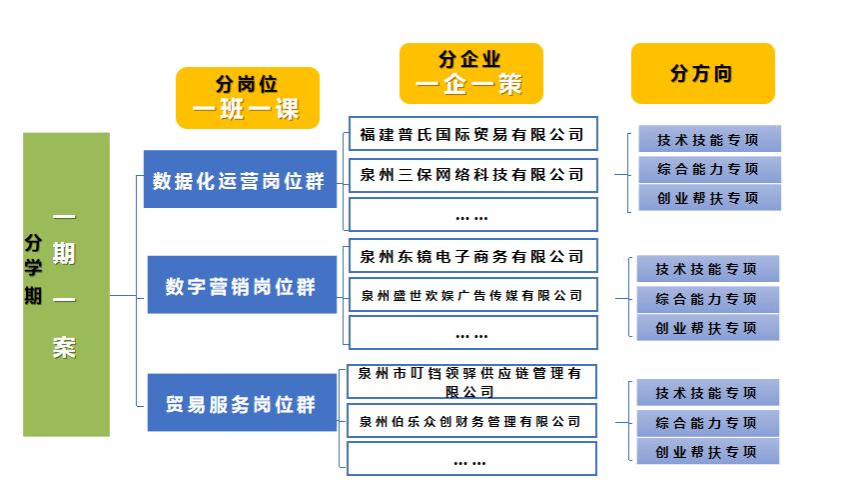 校企共建实训基地,引入泉州东海跨境生态园区内30多家企业,形成“1+1+N”(“1”学院、“1”基地、“N”企业)架构的实训“全场景”;签订合作协议,组织开展学生四个月入企实践,通过真情景、真压力下真岗位、真任务的锻炼提高学生综合实践能力;每学期根据专业特点制定“一期一案”《实训总体方案》,在基地按照岗位群共性要求开展“一班一课”集中教学,在企业按照具体岗位个性要求实施“一企一策”实训、考核;共建驻点工作站(含学校导师、企业导师、基地导师、辅导员、心理老师、志愿者),进行教学指导和实训管理,同时设置1周入企适应期、1次调岗机会满足学生需求;“学校导师+基地导师+岗位导师”多主体,专业技能、职业素养、实训实践表现、企业KPI等多元考核学习成效;基地根据学生工作实绩给予考核优秀学生每生每月500元、800元、1000元奖励。这种注重个体需求的实践教学与评价,促进了学生个性化成长和全面发展。