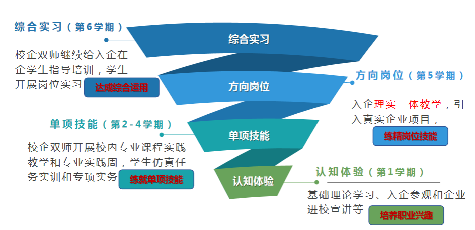 第一阶段认知体验(第1学期),引导学生认知企业、认知职业、认知岗位,培养专业兴趣和职业认同。第二阶段单项技能(第2-4学期),学生仿真任务实训和专项实务,练就单项技能,培养职业认知。第三阶段方向岗位(第5学期),依托真实企业项目开展个性化实践教学,练精岗位技能,获得职业感悟。第四阶段综合实习(第6学期),开展岗位实习,综合运用解决企业实际问题,达成职业提升目标。