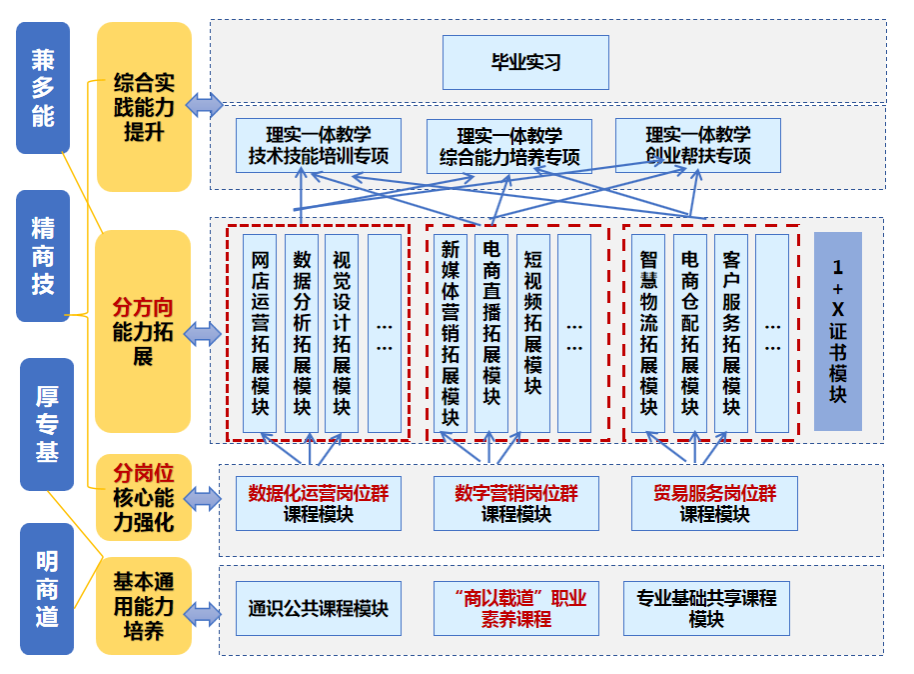 根据企业岗位能力要求,以“明商道、精商技”为理念,校企共研共建“基本通用能力培养-分岗位核心能力强化-分方向能力拓展-综合实践能力提升”四级模块化课程体系,兼顾通用能力、专业技能、个性需求的人才培养。